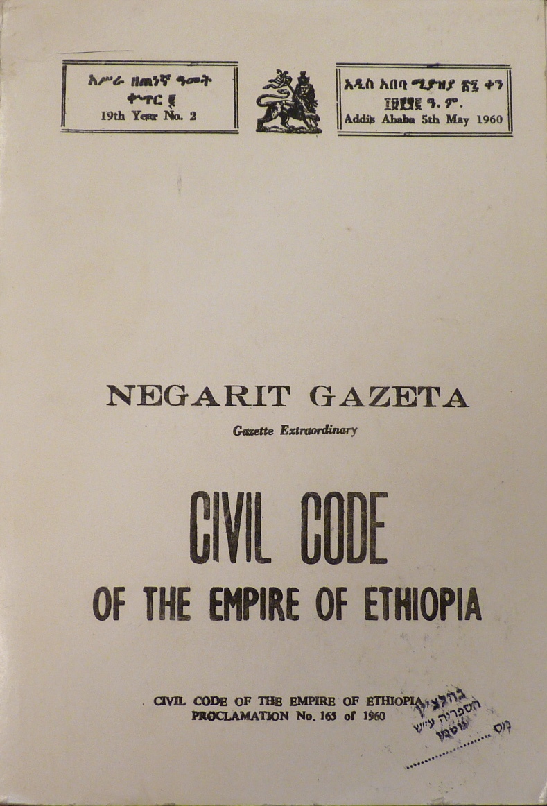| Title: Negarit gazeta : Gazette extraordinary. Civil Code of the Empire of Ethiopia Format: BKS Class No.: ?346(63) NEG Id No.: 256 ONO ITEM No.: 23352 More details |