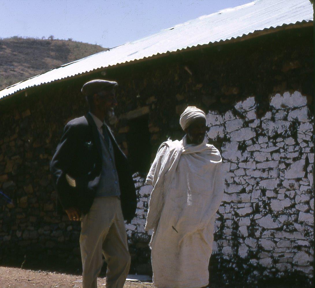 2. YONA BOGALE Yona Bogale visiting Jewish school, Gondar Region. Note this school has stone walls with a metal roof. Undated |