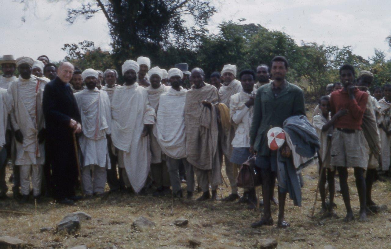 9. YONA BOGALE Group photo with Norman Bentwich with a group of Beta Israel at Tedda. Kahen Rafael Hadani is standing on Bentwich's left. Yona Bogale can be seen in back row, behind Kahen Rafael Hadani. Photo taken 1961. Photo appears in David kessler's book, The Falashas: A Short History of the Ethiopian Jews. |